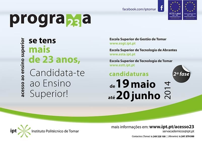 Encontram-se abertas as inscrições para as provas especialmente adequadas destinadas a avaliar a capacidade para a frequência do Ensino Superior dos Maiores de 23 anos (2.ª fase) para todos os Cursos do Instituto Politécnico de Tomar (IPT).