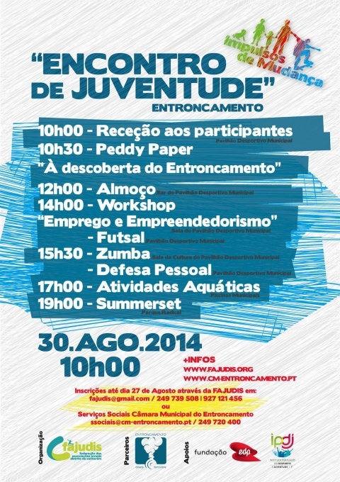 Dirigido a todos os jovens, o evento é composto por várias atividades que irão decorrer ao longo do dia, em diversos espaços da Cidade, sendo o programa o seguinte: 10h00 Receção dos Participantes - Pavilhão Desportivo Municipal | 10H30 Peddy Paper “ À Descoberta do Entroncamento” | 12h00 Almoço - Pavilhão Desportivo Municipal | 14h00 Workshop “Emprego e Empreendedorismo” - Sala Pavilhão Desportivo Municipal; Futsal - Pavilhão Desportivo Municipal | 15h30 Zumba - Sala da Cultura do Pavilhão Desportivo Municipal; Defesa Pessoal - Pavilhão Desportivo Municipal | 17h30 Atividades aquáticas - Piscinas Municipais | 19h00 Summerset - Parque Radical.