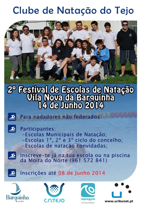 O CNTejo - Clube de Natação do Tejo, em colaboração com a Câmara Municipal de Vila Nova da Barquinha, vai levar a efeito o “2.º Festival de Escolas de Natação da Barquinha 2014”, que se realizará a 14 de junho, nas Piscinas Municipais da Barquinha.