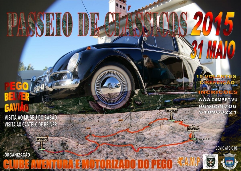 Dia 31 de maio, o Clube Aventura e Motorizado do Pego organiza o Passeio de Clássicos com passagem por Belver e Gavião e visitas ao Museu do Sabão e Castelo de Belver. O custo é de 15 “volantes”, com refeição incluída. Os interessados devem inscrever-se em www.camp.pt.vu, 969 659 706 ou 918 909 221.