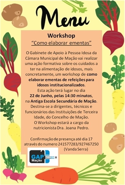 Dia 22 de junho terá lugar em Mação um workshop com a nutricionista Joana Pedro que tem como objectivo auxiliar na preparação de ementas saudáveis, com os devidos cuidados, especialmente para o público idoso.