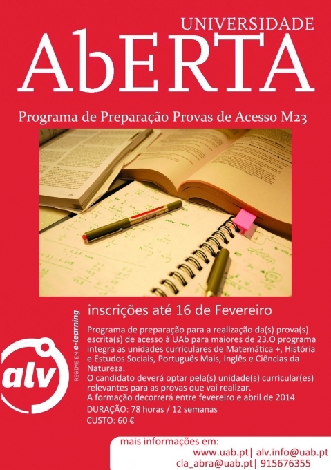 A formação tem início a 22 de fevereiro e termina a 13 de maio. Informação e formulário de inscrição online em http://www.uab.pt/web/guest/estudar-na-uab/oferta-pedagogica/alv/programas-alv/maiores-de-23.