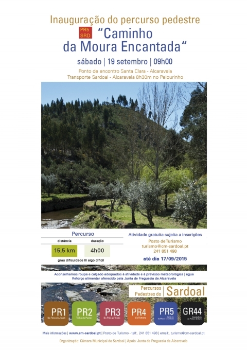 A 19 de setembro decorrerá a inauguração do Percurso Pedestre PR5 “Caminho da Moura Encantada”, que passará por vários locais da freguesia de Alcaravela: Ribeira das Sarnadas, Rosa Mana, Albufeira da Barragem da Lapa, Vale Formoso, Pisão, Casos Novos e Panascos. O Percurso, com inauguração às 9h00m, em Santa Clara, Alcaravela, tem um itinerário circular de cerca de 15km com grau de dificuldade III algo difícil.