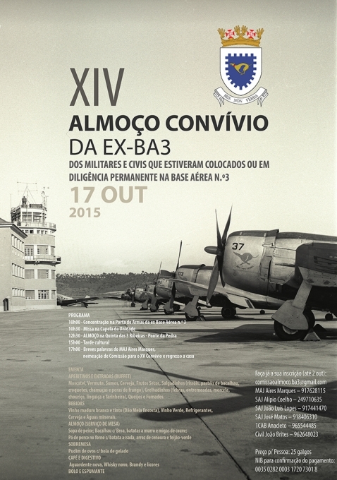 No dia 17 de outubro, realiza-se mais um almoço convívio dos militares e civis que estiveram colocados ou em diligência permanente na Base Aérea N.º 3 (BA3), em Tancos, concelho de Vila Nova da Barquinha. Esta iniciativa, que vai já na 14.ª edição, inicia-se com a concentração na porta de armas da Ex BA3, logo pela manhã (10h00), seguida de missa na Capela da Unidade, celebrada pelo Capelão António Bernardo, meia hora mais tarde. Ponto alto do encontro, o almoço, será servido na Quinta das 3 Ribeiras, por volta das 12h30. Atividades culturais irão preencher a tarde dos convivas, por entre memórias de outros tempos e momentos de confraternização.