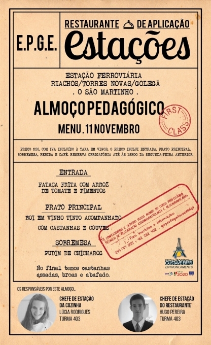 Este menu assinala o São Martinho, numa paragem pela Estação de Riachos/Torres Novas/Golegã. Tem como chefes da Estação Hugo Pereira (chefe de Sala) e Lúcia Rodrigues (chef de Cozinha), ambos alunos finalistas do Curso Profissional de Restauração - Cozinha/Pastelaria e Restaurante/Bar (turma 403).