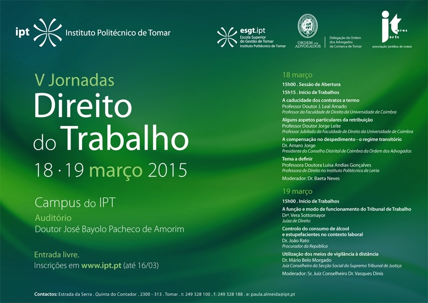 Decorre nos próximos dias 18 e 19 de março, pelas 15h00, no auditório doutor José Bayolo Pacheco de Amorim, do Instituto Politécnico de Tomar (IPT) a V edição das Jornadas de Direito do Trabalho. A entrada é livre, mas sujeita a inscrição em www.ipt.pt até ao dia 16 de março.