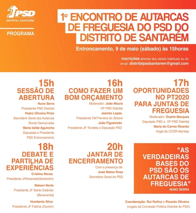 Do programa de trabalho, destaca-se a sessão de abertura, pelas 15 horas, a cargo de Nuno Serra, presidente da Comissão Política Distrital do PSD, de Pedro Oliveira Pinto, Secretário-Geral dos Autarcas Social Democratas, e da deputada e presidente do PSD do Entroncamento, Maria Isilda Aguincha.