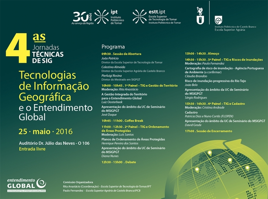 No dia 25 de maio, no âmbito do Mestrado em Sistemas de Informação Geográfica, Planeamento e Gestão do Território do Instituto Politécnico de Tomar/Instituto Politécnico de Castelo Branco, decorre no auditório Dr. Júlio das Neves – 0106, no campus do IPT, pelas 9h30, as 4.as Jornadas Técnicas de Sistemas de Informação Geográfica, com o temaTecnologias de Informação Geográfica e o Entendimento Global.