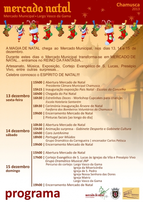 O objetivo principal deste Mercado é a envolvência de todos para que se mantenham as tradições e não se perca o espírito natalício. O programa será variado e vai ser focado nas crianças, sobretudo no primeiro dia, 13 de Dezembro, iniciando a tarde com uma exposição de Pais Natal, da autoria de todas as escolas do concelho. A tarde vai ter lugar para um Workshop de Cupcakes com “Estrelinhas Doces” para os mais novos. Sem esquecer a chegada do Pai Natal que vai atender os pedidos dos mais novos. A noite encerra com a cerimónia de Inauguração da Árvore de Natal, como vem sendo hábito, com a Fanfarra dos Bombeiros da Chamusca.
