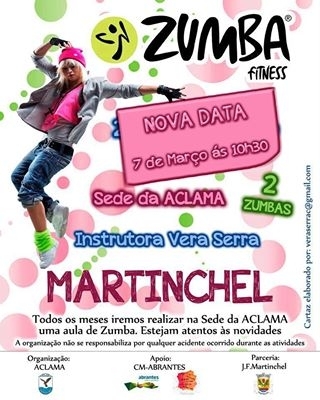No próximo dia 7 de março, pelas 10h30 irá decorrer no pavilhão da ACLAMA - Associação Cultural Os Amigos de Martinchel, uma aula de zumba. Esta é uma atividade que se integra no projeto de desporto da ACLAMA, que conta com o apoio do programa de apoio às coletividades - FINABRANTES.