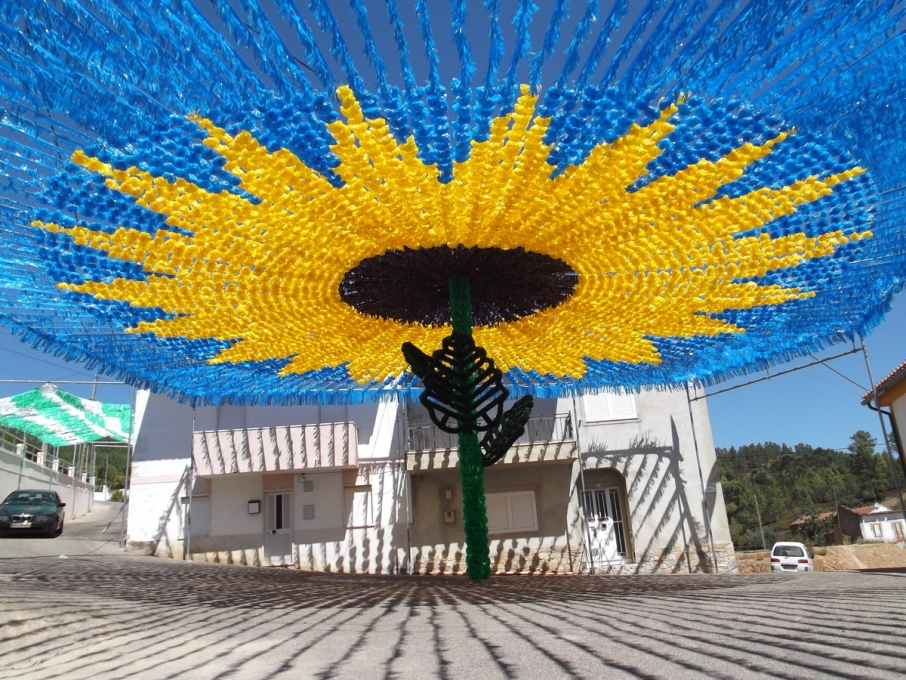 As gentes desta terra dedicaram os seus tempos livres ao longo do ano a fazer flores para enfeitar as ruas da sua aldeia nesta data e o girassol gigante (o maior do mundo feito com flores artificiais) ficou concluído esta noite.