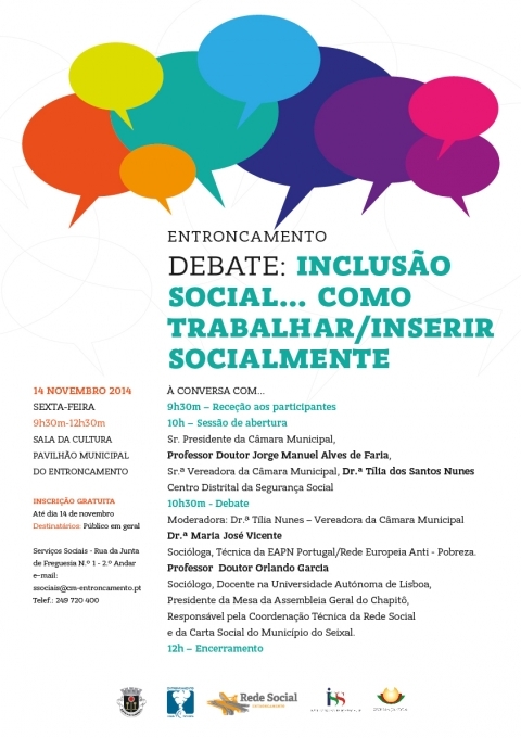 09h30 | Receção dos participantes; 10h00 | Sessão de abertura: presidente da Câmara Municipal do Entroncamento Jorge Faria, vereadora, Tília Nunes, representante do Centro Distrital da Segurança Social-Santarém; 10h30 | Inicio do Debate, com Maria José Vicente, Socióloga da EAPN Portugal/Rede Europeia Anti-Probreza, Orlando Garcia, Sociólogo, Docente na Universidade Autónoma de Lisboa, presidente da Mesa da Assembleia Geral do Chapitô e responsável pela Coordenação Técnica da Rede Social e da Carta Social do Município do Seixal; 12h00 | Encerramento