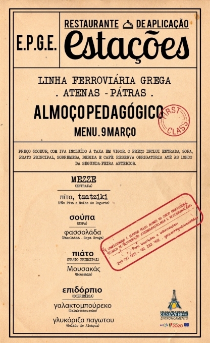 O Restaurante de Aplicação da Cooptécnica Gustave Eiffel do Entroncamento, "Estações", apresenta o menu para o próximo almoço pedagógico, dia 9 de março (quarta-feira). O menu promete uma viagem gastronómica pela linha ferroviária grega, de Atenas a Pátras.