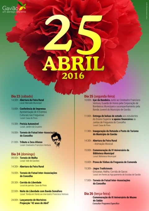 9h00 – Torneio de Malha (Vale de Gaviões); 14h30 – Abertura da Feira Rural; 16h00 - Torneio de Futsal Inter-Associações do Concelho; 20h30 – Corrida da Liberdade (partida da Casa do Povo de Gavião); 22h00 – Noite da Liberdade com a Banda Semáforo (tenda em frente ao Cineteatro Francisco Ventura); 24h00 – Lançamento de morteiros, projecção do filme “42 anos de Abril).