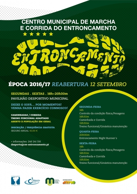 O CMMC – Centro Municipal de Marcha e Corrida do Entroncamento, inicia amanhã, 12 de setembro a época 2016/2017. Localizado no Pavilhão Desportivo Municipal, o CMMC funciona às segundas e sextas-feiras das 18h00 às 20h30.