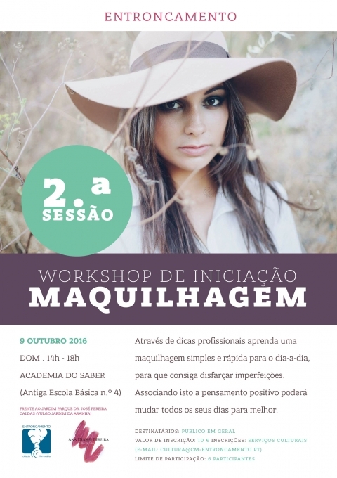 A Câmara Municipal do Entroncamento promove, a 9 de outubro, a segunda. sessão do workshop de Iniciação à Maquilhagem, com a maquilhadora Ana Duque PereiraA atividade decorre das 14h00 às 18h00, no edifício da Academia do Saber (antiga Escola Básica n.º 4), junto ao Jardim da Aranha.