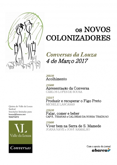 “Os novos colonizadores” é o tema da próxima “Conversa” na Quinta do Valle da Louza, em Sentieiras (Abrantes/Sardoal), marcada para 4 de março. As ‘Conversas do Louza’, feitas em parceria com o jornal abarca, pretendem fomentar a conversa e a discussão, abordar temas que agitem as mentes que olhem bem para a frente mesmo que abordem o passado”. Isto porque “conversar tem de ser um acto de prazer e convivência