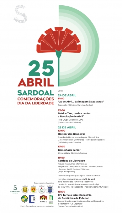 A Biblioteca Municipal de Sardoal acolhe, de 24 de abril a 31 de maio, a exposição “25 de Abril… da imagem às palavras”, composta por livros, fotografias e cartoons alusivos ao tema. Ainda no dia 24, o Centro Cultural Gil Vicente recebe, pelas 21h30m, o espetáculo “Ver, ouvir e cantar a Revolução de Abril”, pelo Grupo Coral do GETAS.