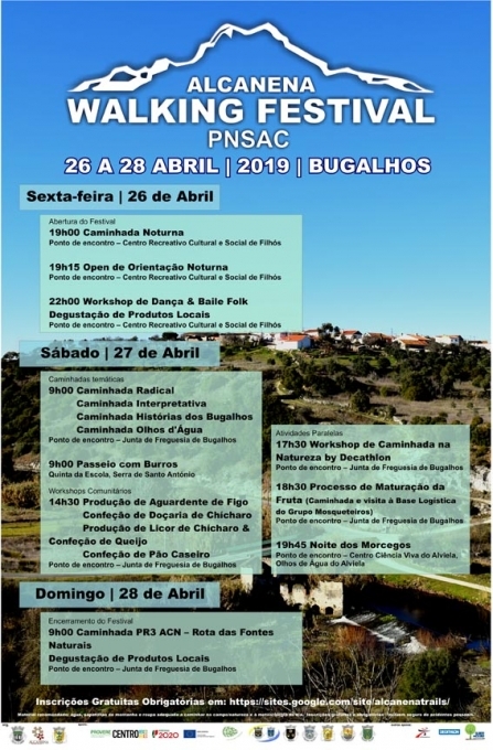 A Câmara Municipal de Alcanena promove, entre os dias 26 e 28 de abril, na freguesia de Bugalhos e no Parque Natural das Serras de Aire e Candeeiros a edição de 2019 do Alcanena Walking Festival. O Alcanena Walking Festival 2019 é uma iniciativa da Câmara Municipal de Alcanena, organizada em conjunto com a Junta de Freguesia de Bugalhos.