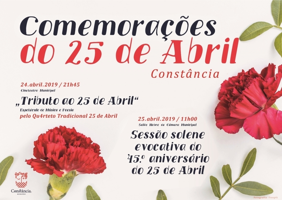 Um espetáculo de música e poesia denominado "Tributo ao 25 de Abril" e uma Sessão Solene Evocativa do 45º aniversário do 25 de Abril são os dois momentos comemorativos do 25 de Abril em Constância.