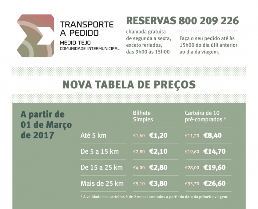 Foi aprovada pela Comunidade Intermunicipal do Médio Tejo a alteração do tarifário do serviço de Transporte a Pedido no Médio Tejo, de modo a equiparar os preços dos bilhetes deste serviço às tarifas utilizadas nos transportes interurbanos.