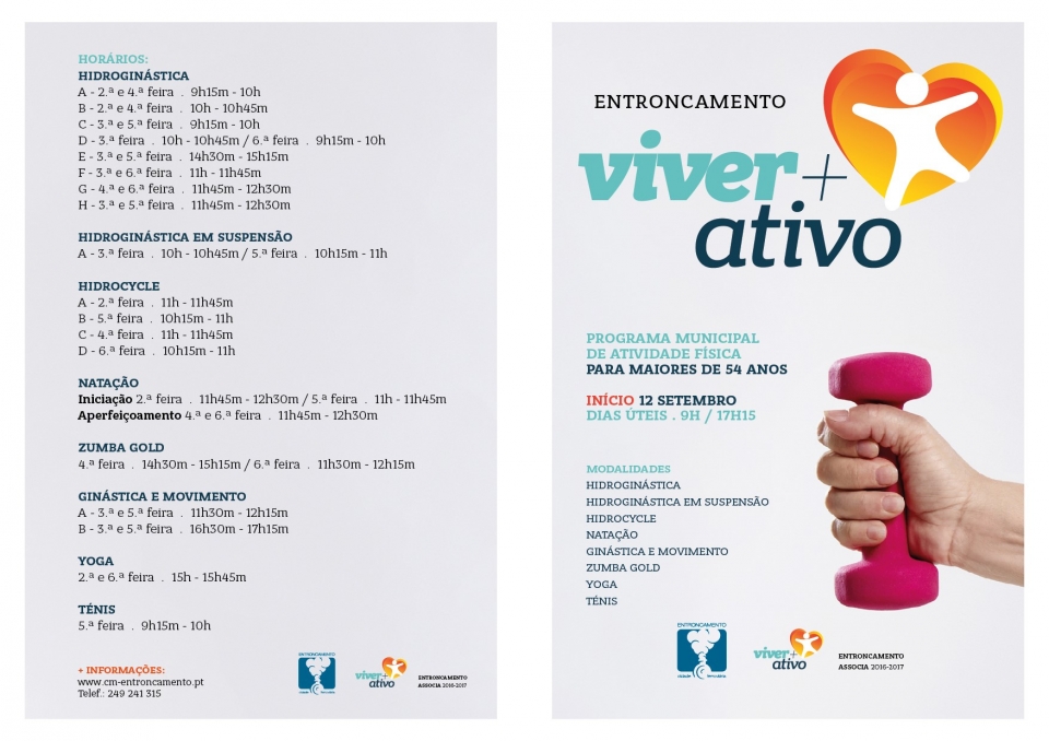 Dirigido à população sénior com idade superior a 54 anos, o Programa VIVER+ATIVO tem como objetivo promover o bem-estar físico e psicológico, a inclusão social e o relacionamento interpessoal da população sénior do concelho do Entroncamento.