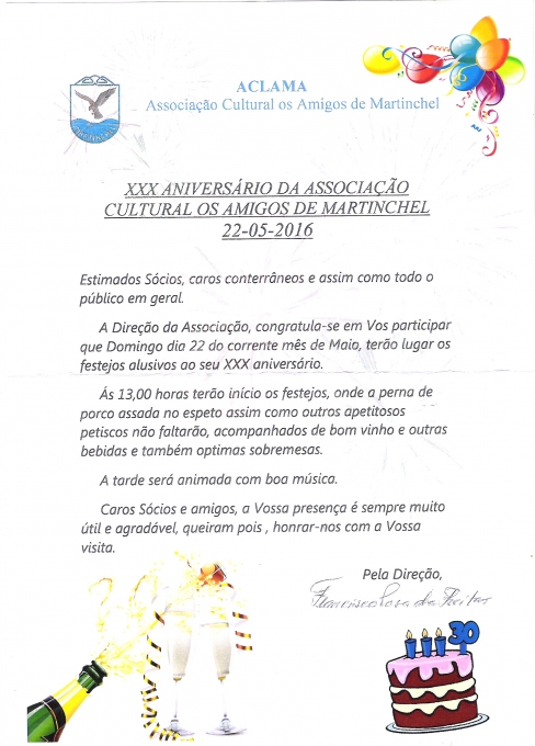 A ACLAMA, Associação Cultural Os Amigos de Martinchel, comemora o seu 30º aniversário a 22 de maio, pelas 13h00, na sede desta associação.