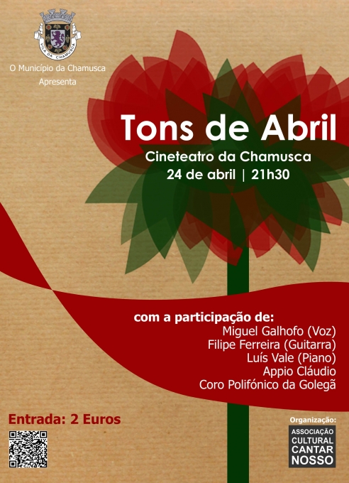O Município da Chamusca apresenta amanhã, dia 24, pelas 21h30, no Cineteatro da Chamusca, “Tons de Abril”, breve antologia de autores de Abril, um espetáculo que assinala o 42.º aniversário do 25 de Abril de 1974.