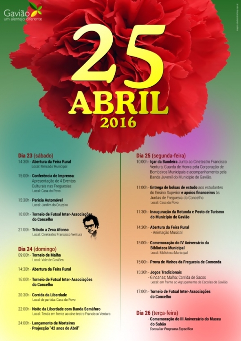 O concelho de Gavião vai comemorar os 42 anos do 25 de Abril de 74 com diversas iniciativas que se prolonga de dia 23 a 26, com o seguinte programa: