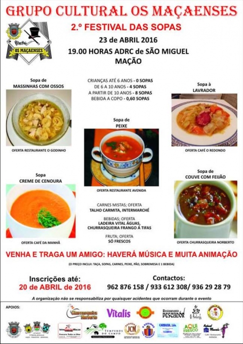 Termina amanhã, ia 20, as inscrições para o 2.º Festival das Sopas, a realizar no sábado, 23 de abril, a partir das 19h00, na Associação de S. Miguel, em Mação.
