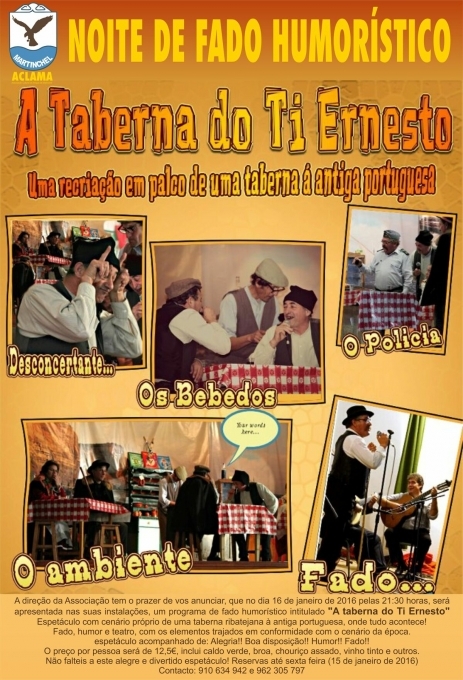 A ACLAMA - Associação Cultural Os Amigos de Martinchel, promove a Noite de Fado Humorístico "A Taberna do Ti Ernesto", no dia 16, pelas 21h30 na sede da associação. Trata-se de uma recriação à palco de uma ... +