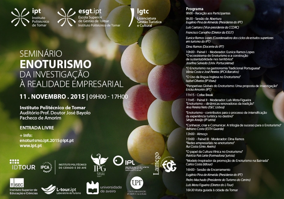 O Seminário Enoturismo - da Investigação à realidade Empresarial, que decorre no dia 11 de novembro, pelas 9h00, no auditório Prof. Doutor José Bayolo Pacheco de Amorim, em Tomar, surge com o objetivo de dar relevo à ... +