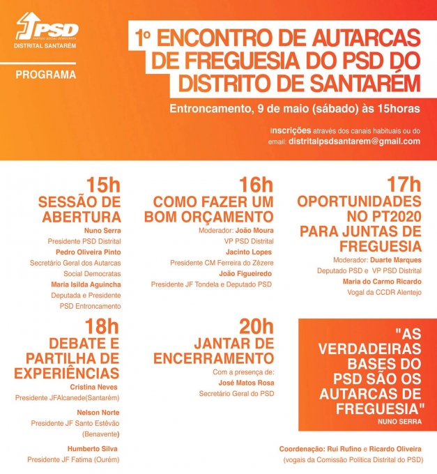 O PSD Distrital de Santarém vai realizar o primeiro Encontro de Autarcas de Freguesia, no sábado, dia 9, no concelho do Entroncamento, com a presença do Secretário-Geral do PSD, José Matos Rosa.