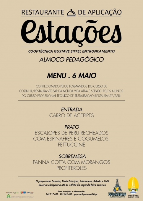 O Restaurante de Aplicação da Cooptécnica Gustave Eiffel do Entroncamento, "Estações", apresenta a ementa para o próximo almoço pedagógico, a decorrer entre as 12h30min e as 14hde dia 6.