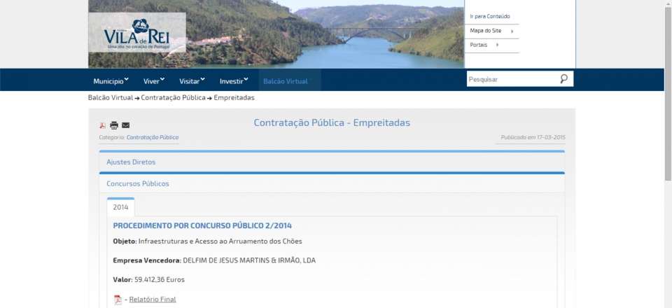 O website do Município de Vila de Rei, disponível em www.cm-viladerei.pt, disponibiliza, através do separador “Balcão Virtual”, todos os dados de contratação pública referentes a bens, serviços e empreitadas do Município.