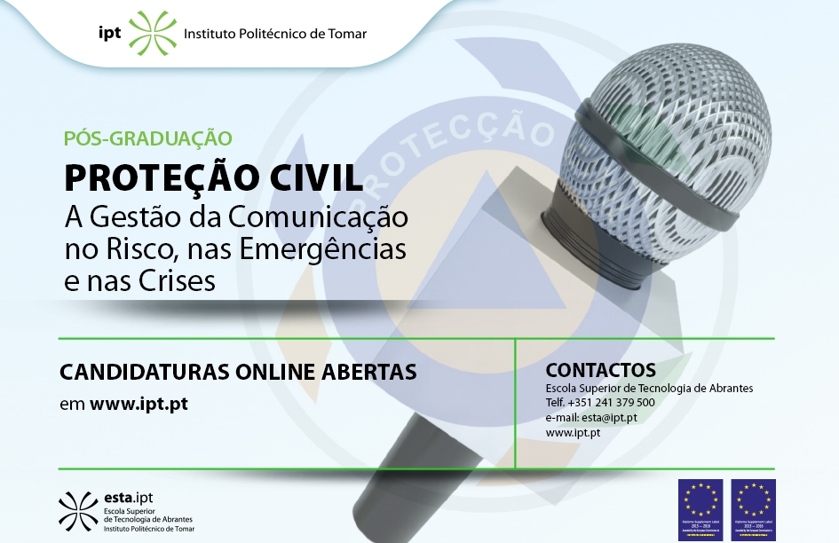 Encontram-se abertas as candidaturas online para o curso de Pós-graduação Proteção Civil - Gestão da Comunicação no Risco, na Emergência e na Crise, promovida pela Escola Superior de Tecnologia de Abrantes (ESTA) do Instituto Politécnico de Tomar ... +