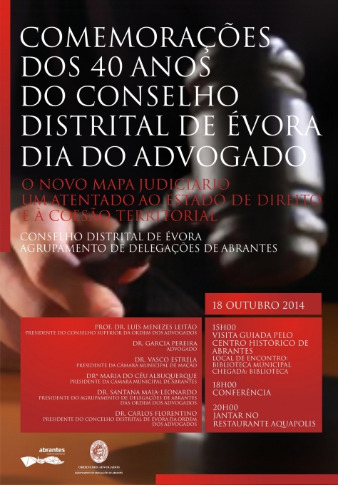 No âmbito das Comemorações dos 40 Anos do CDE, o Conselho Distrital e a Delegação de Abrantes organizam uma conferência sobre o novo mapa judiciário, no auditório da Biblioteca Municipal, em Abrantes, dia 18 de outubro
