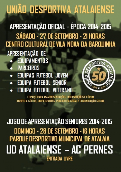 A apresentação das equipas da União Desportiva Atalaiense - Época 2014-2015, irá realizar-se a 27 de setembro, pelas 21 horas, no Centro Cultural de Vila Nova da Barquinha.