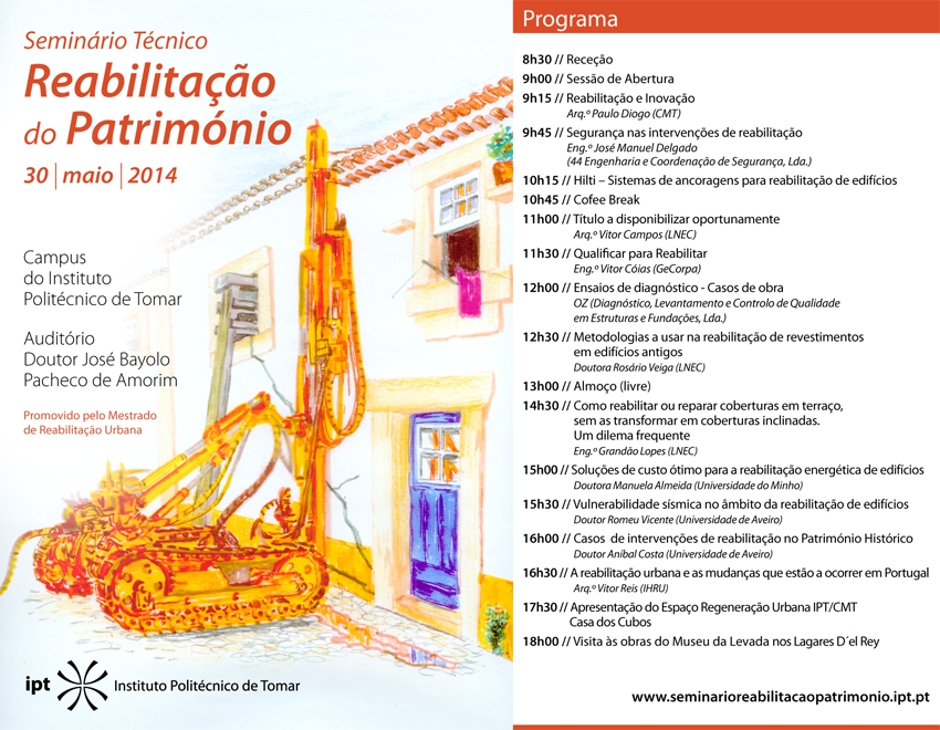 Decorre no próximo dia 30 de maio, pelas 9h00h, no auditório doutor José Bayolo Pacheco de Amorim, no campus do IPT, o Seminário Técnico sobre Reabilitação do Património promovido pelo curso de mestrado em Reabilitação Urbana da ... +