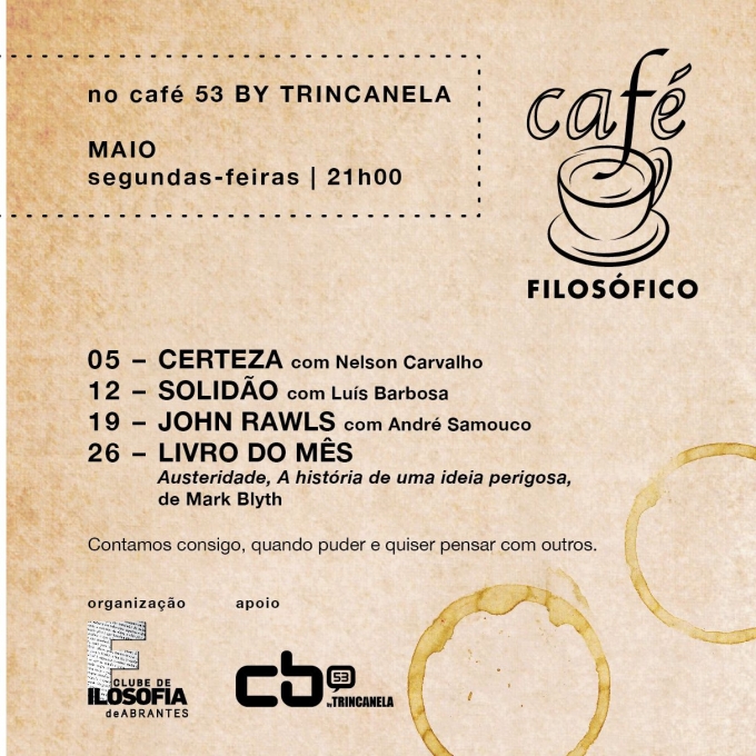 Para maio os organizadores do Café Filosófico propõe, no dia 12, o tema “solidão”, com Luís Barbosa. Uma semana depois, André Samouco irá falar sobre John Rawls. O livro do mês, a analisar a 26 de maio, ... +