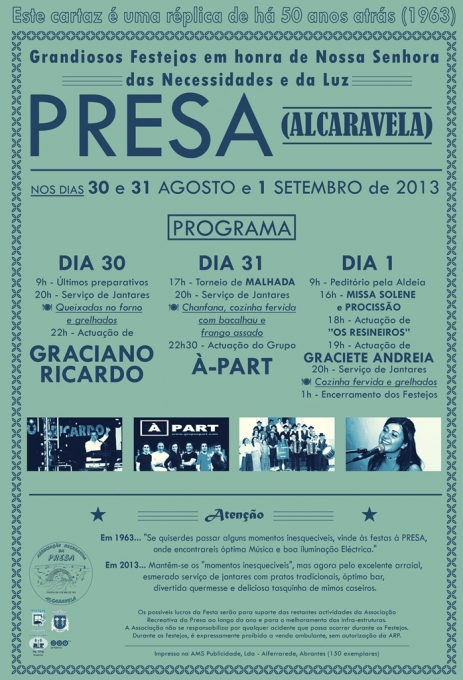 As Festas da Presa (Alcaravela, Sardoal) são das mais antigas na nossa região e louvam Nossa Senhora das Necessidades e da Luz. Este ano leva-se a efeito a edição 123, organizada pela Associação Recreativa da Presa, em ... +